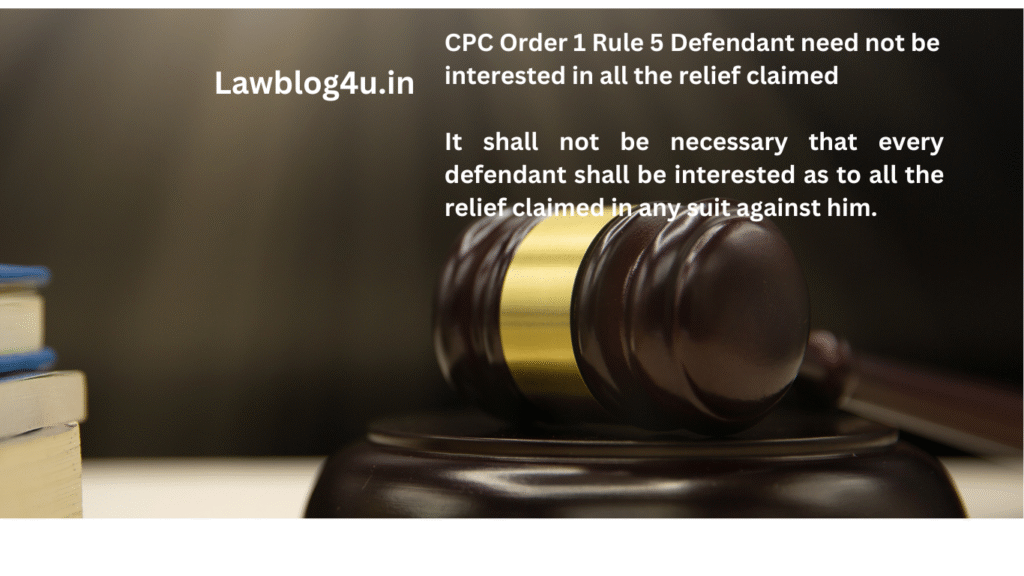 CPC Order 1, Rule 5 defines the parties to a suit; according to this provision, it is not necessary that every defendant party be interested in all relief claimed in a lawsuit. The court can allow multiple defendants with different interests in a suit for efficiency purposes if a common question of fact and law is involved to prevent a multiplicity of proceedings. However, it is not necessary that every defendant is interested in the relief that is claimed against him.